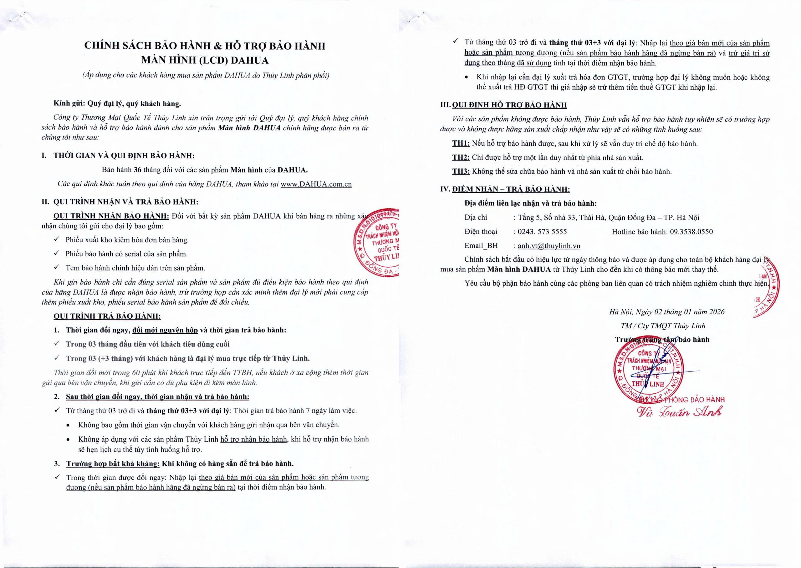 Chính sách bắt đầu có hiệu lực từ ngày thông báo và được áp dụng cho toàn bộ khách hàng đại lý mua sản phẩm Màn hình DAHUA từ Thủy Linh cho đến khi có thông báo mới thay thế.