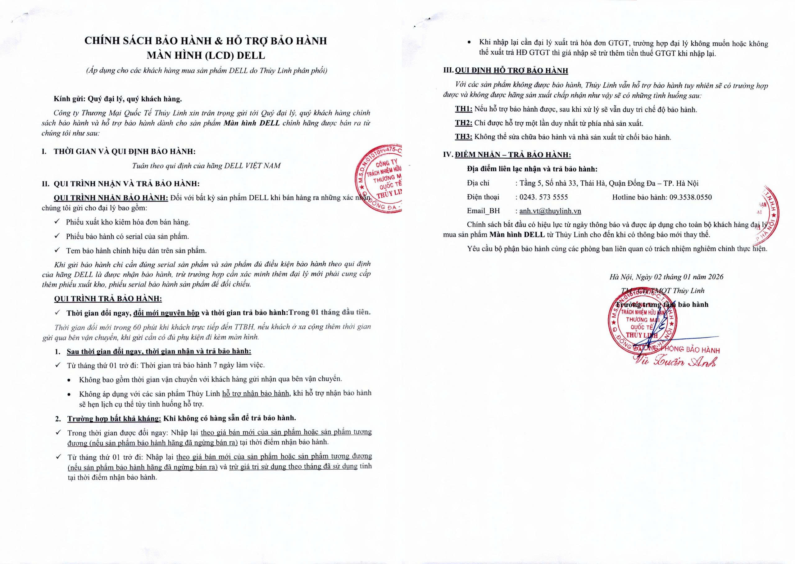 Chính sách bắt đầu có hiệu lực từ ngày thông báo và được áp dụng cho toàn bộ khách hàng đại lý mua sản phẩm Màn hình DELL từ Thủy Linh cho đến khi có thông báo mới thay thế.