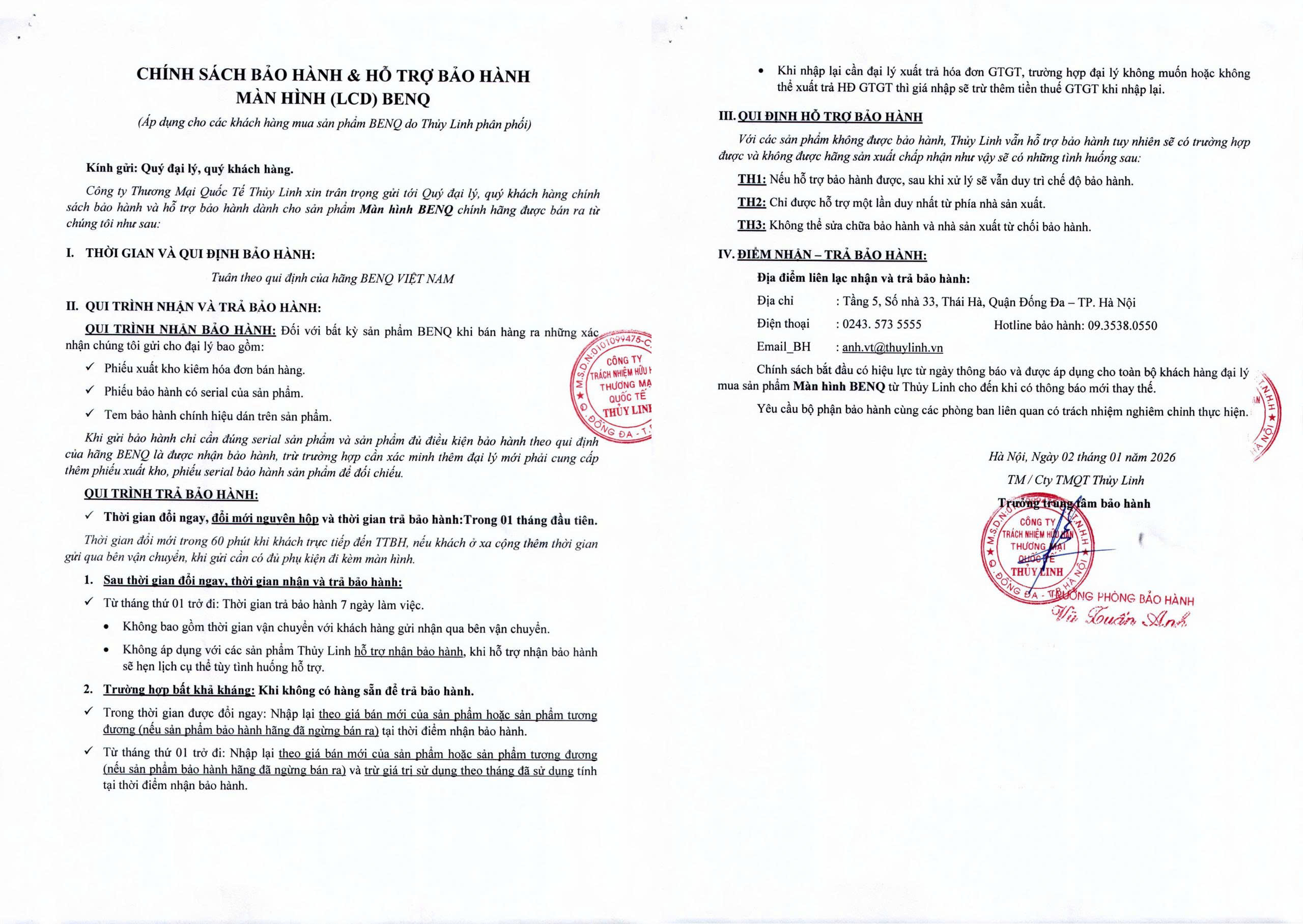 Chính sách bắt đầu có hiệu lực từ ngày thông báo và được áp dụng cho toàn bộ khách hàng đại lý mua sản phẩm Màn hình BENQ từ Thủy Linh cho đến khi có thông báo mới thay thế.