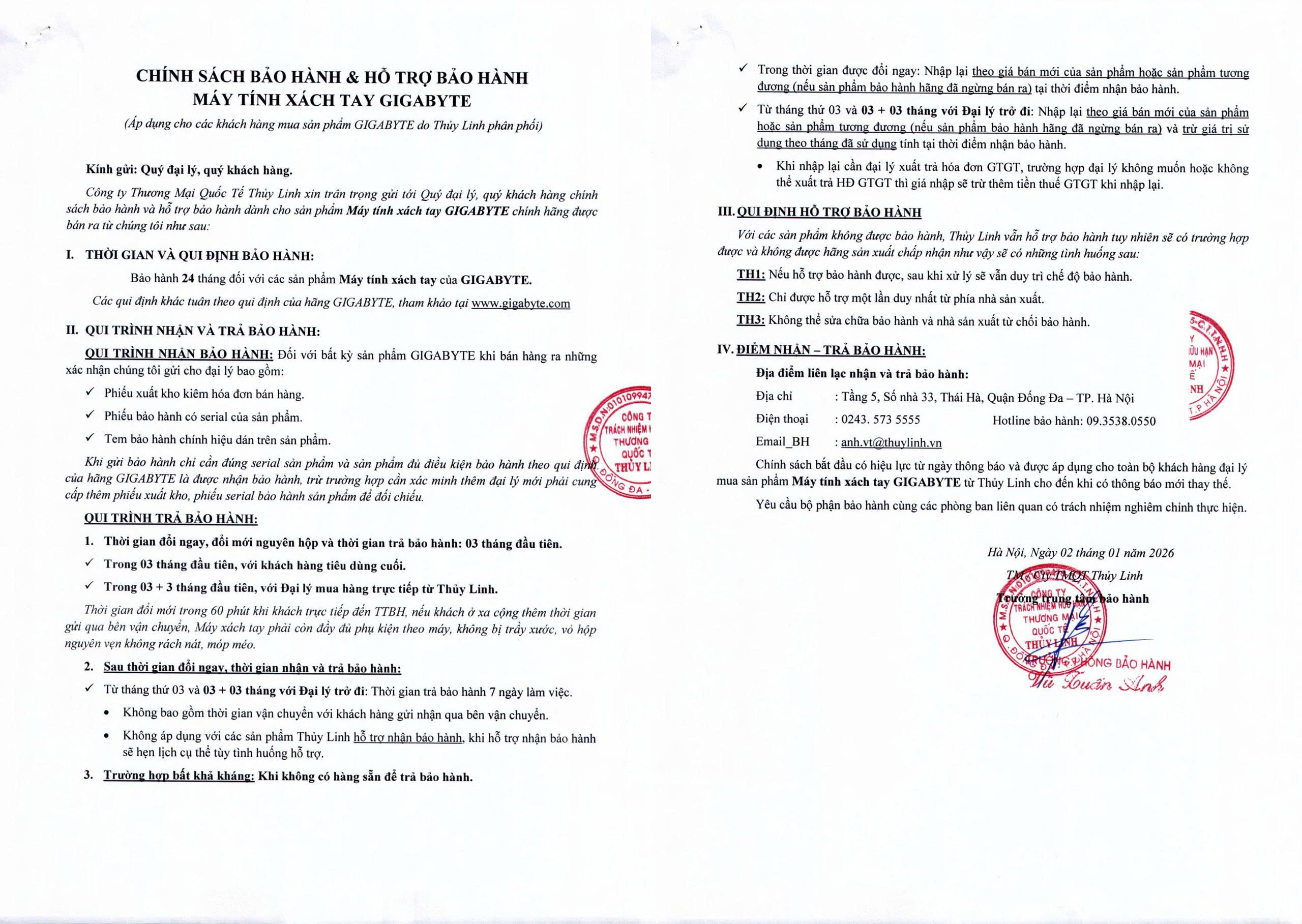 Chính sách bắt đầu có hiệu lực từ ngày thông báo và được áp dụng cho toàn bộ khách hàng đại lý mua sản phẩm Máy tính xách tay GIGABYTE từ Thủy Linh cho đến khi có thông báo mới thay thế.