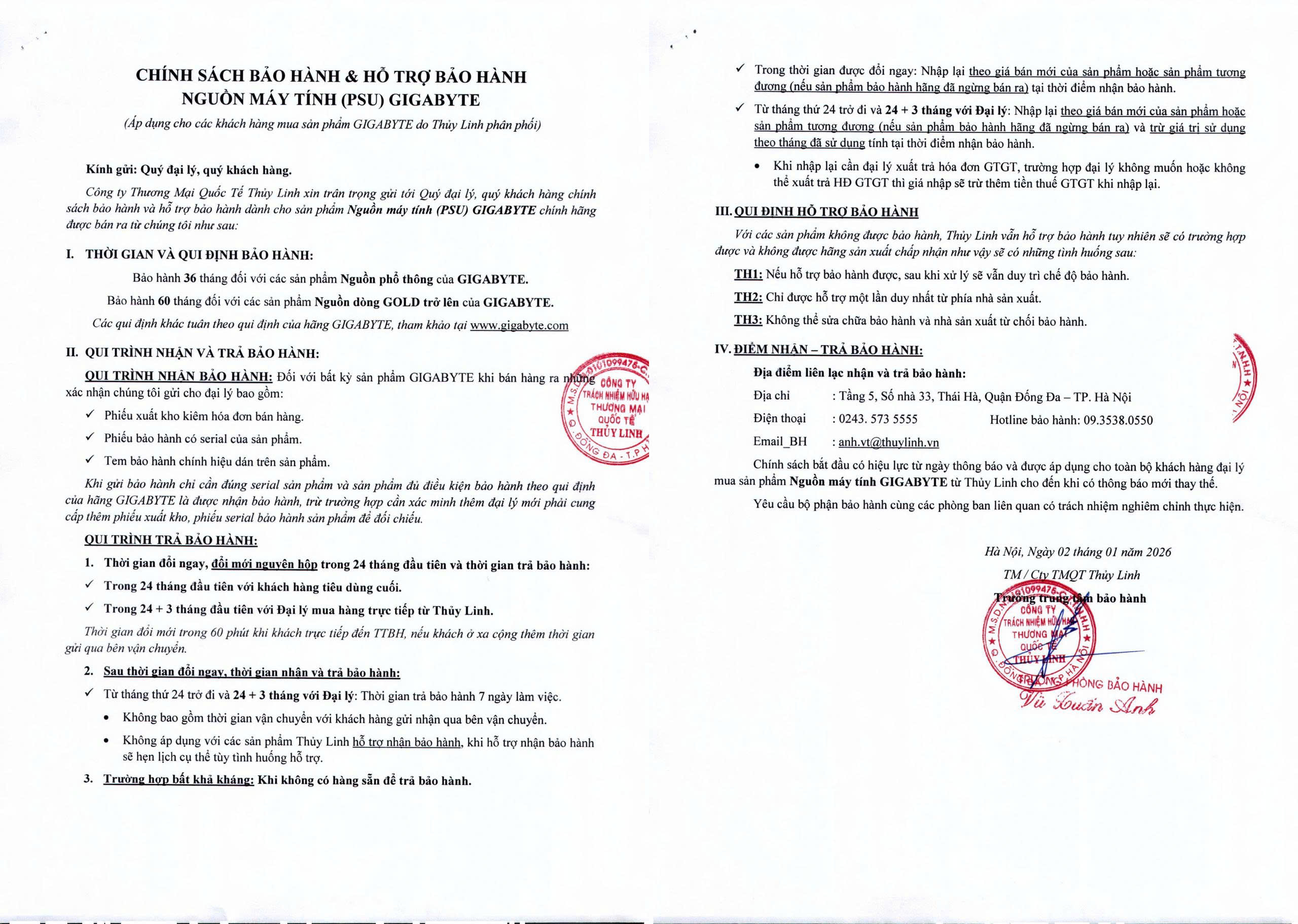 Chính sách bắt đầu có hiệu lực từ ngày thông báo và được áp dụng cho toàn bộ khách hàng đại lý mua sản phẩm Nguồn máy tính GIGABYTE từ Thủy Linh cho đến khi có thông báo mới thay thế.