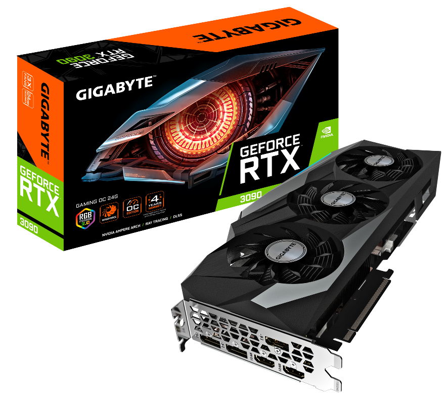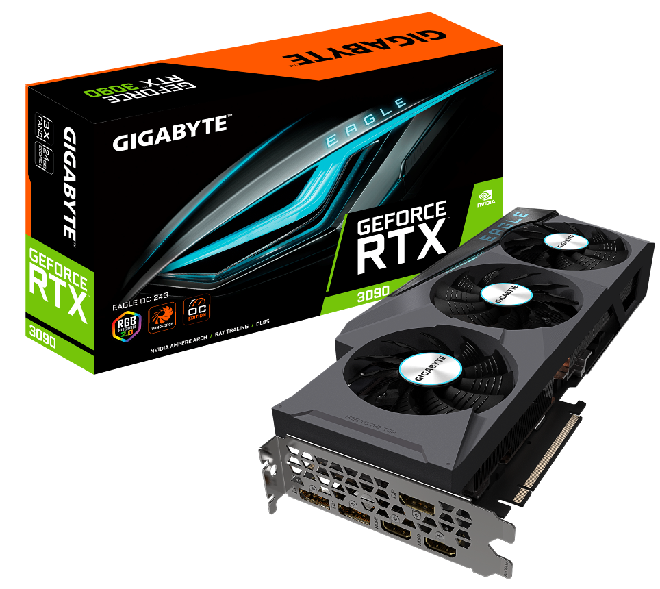 Đây là lần đầu, Gigabyte trình làng đồng thời 4 card đồ họa: Geforce RTX3090 GAMING OC 24G, Geforce RTX3090 EAGLE OC 24G, Geforce RTX3080 GAMING OC 10G, Geforce RTX3080 EAGLE OC 10G. Cả bốn cards này đều được trang bị hệ thống tản nhiệt GIGABYTE WINDFORCE 3X  nhằm hỗ trợ hệ thống card GPU của dòng NVIDIA GeForce RTX30 series này.